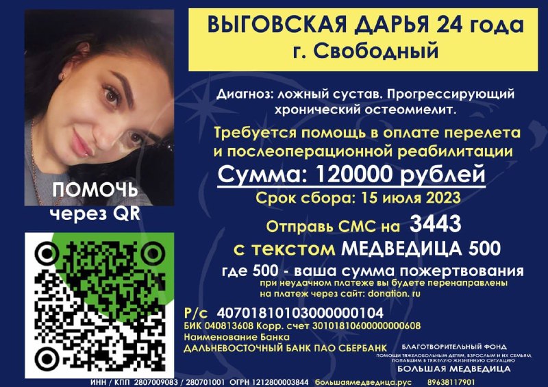 Девушке предстоит очередная операция. Само вмешательство - по квоте, но на дорогу, реабилитацию и аппараты для поддержки нужны средства. Амурчанка продолжает работать, однако собственных финансов всё равно не хватает.