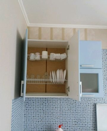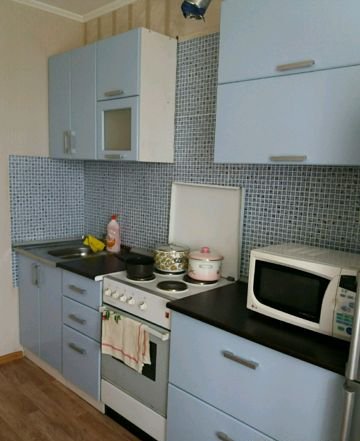 - кухонный гарнитур, обеденная зона, посуда, холодильник, микроволновая печь, эл плита, эл чайник