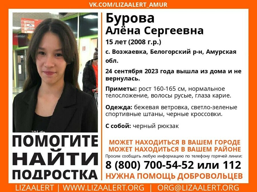 «Просим всех, кто ехал по федеральной трассе «Амур» от села Возжаевка, Белогорского района в сторону Хабаровска 24 сентября с 07:00, поделиться видеозаписью с автомобильных регистраторов. Водители, пожалуйста, посмотрите свои записи и прикреплённую к посту ориентировку. Возможно, под ваши камеры попала пропавшая и именно благодаря вам мы сможем найти Алёну Сергеевну Бурову», – обратились к автомобилистам поисковики.