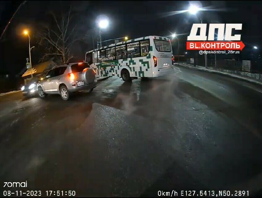 В Благовещенске RAV «спрятался» за автобусом и чудом не попал в страшное ДТП (видео)